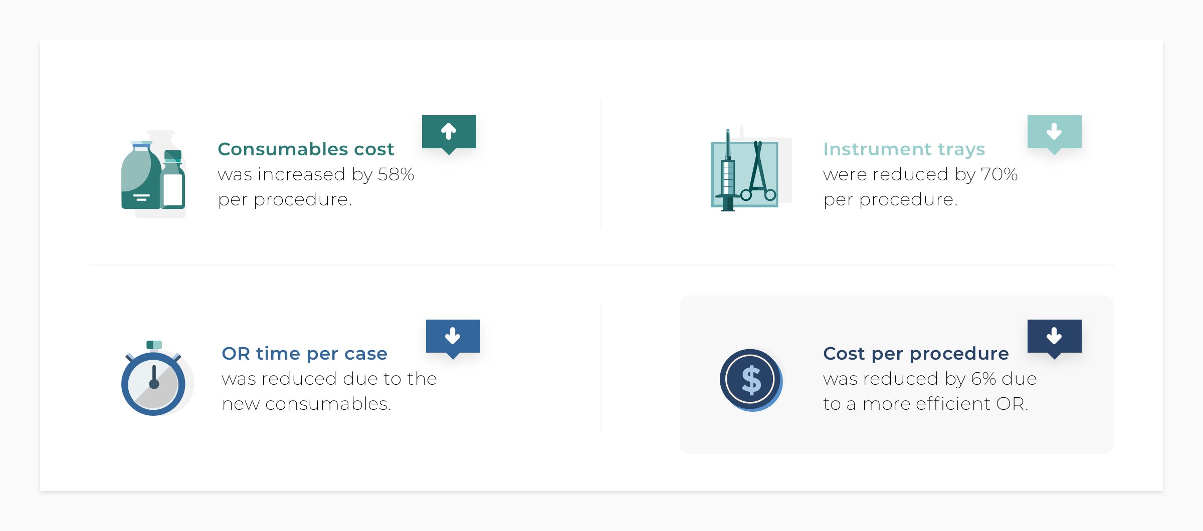 Alongside purchasing the new consumables, the hospital also implemented a 70% reduction in instrument trays used per surgery. This result was a more efficient OR process, so much so that the overall financial impact was a reduction in cost per surgery of 6%.