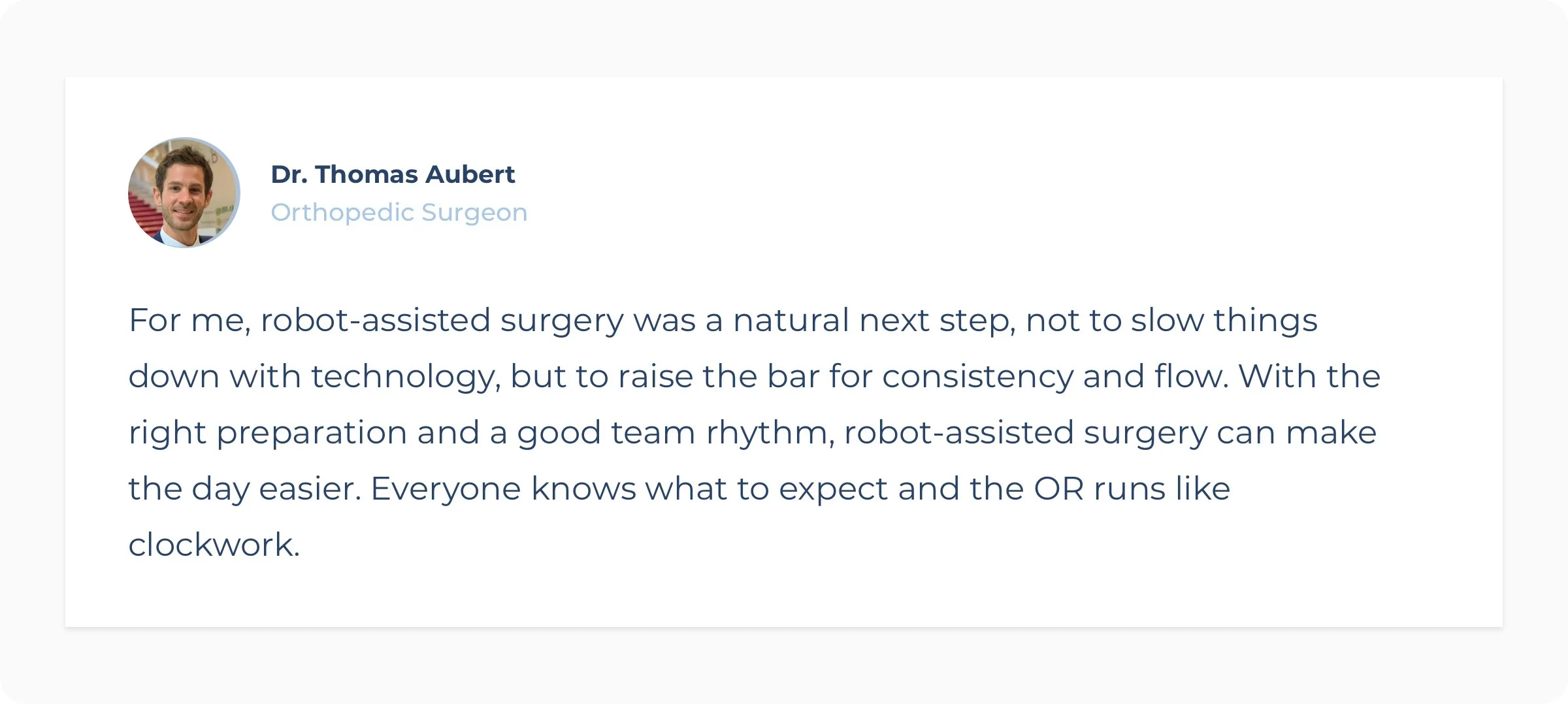 Rather than disrupting his workflow, robotic-assisted surgery became an enabler that strengthened the operating room efficiency he had already built. Integration was smooth, and the impact was immediate.