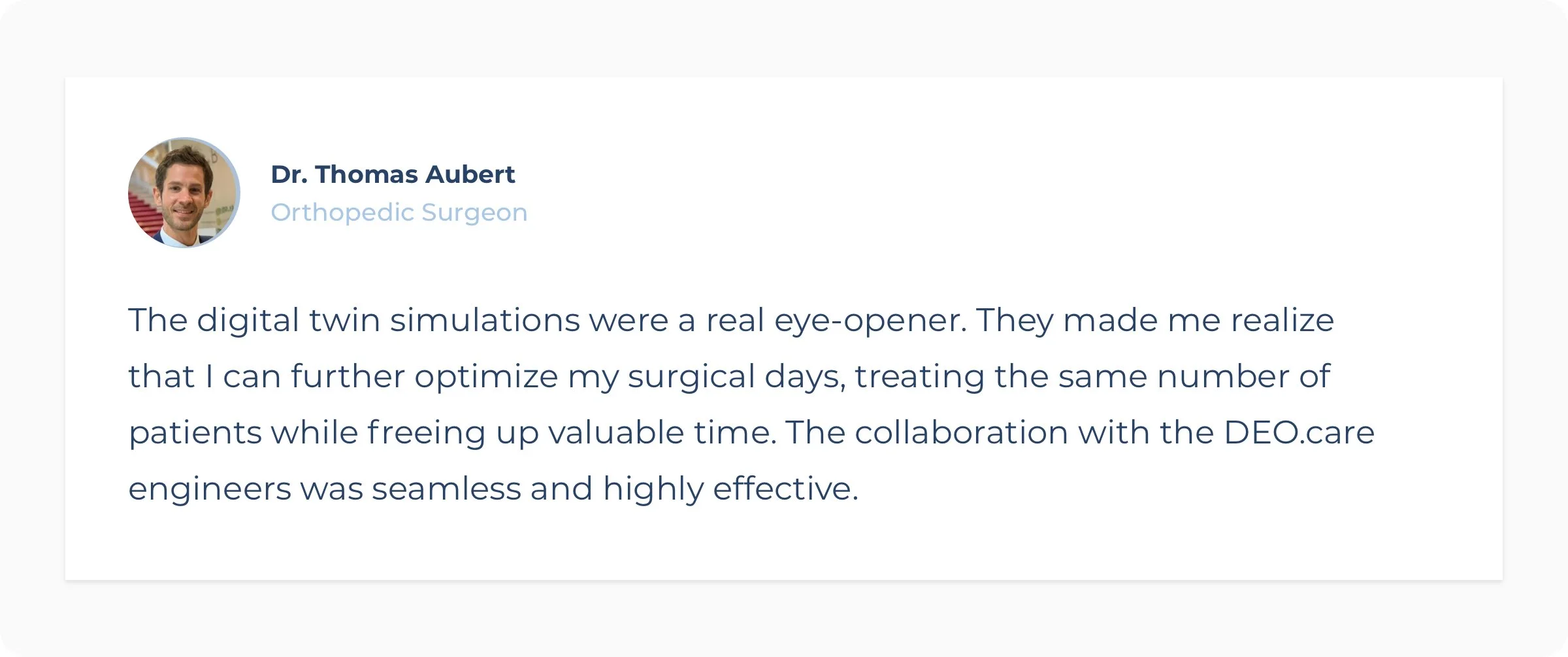 Using the DEO.care digital twin platform, Dr. Aubert’s OR workflow was mapped and analyzed in detail. The analysis confirmed what the team already knew: the workflow functions as a well-aligned system.