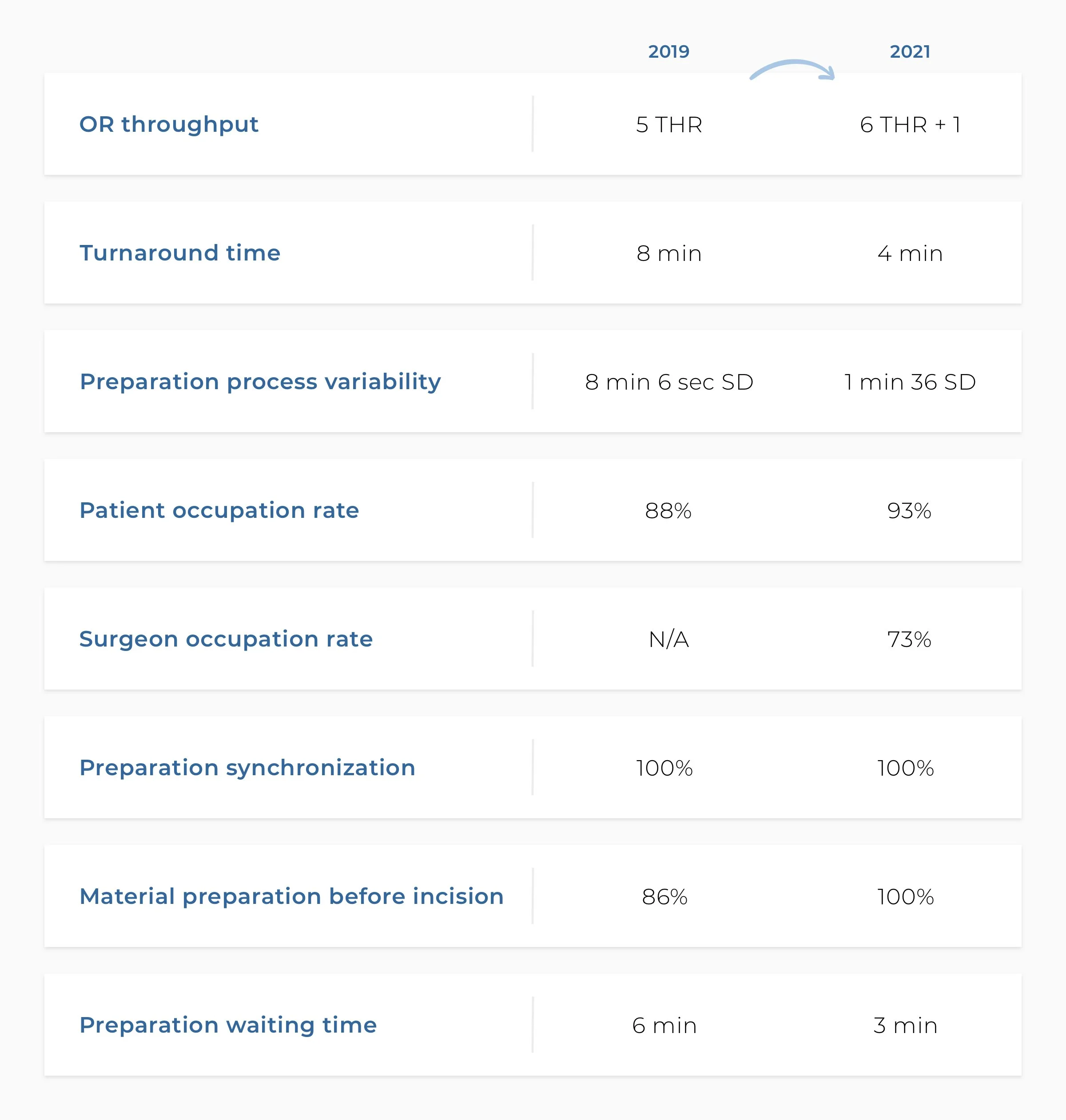 Even what appears to be minor improvements, in this case, has ultimately shown to save the partner hospital a lot of time as shown in the metrics overview below, comparing 2019 and 2021.